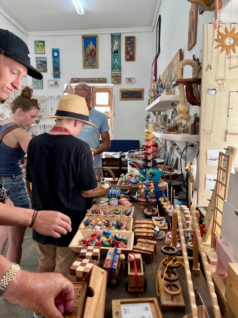 A smaller island than Milos in terms of occupancy and historical sites, it more than made up for any perceived deficiencies in terms of beauty and hikes. We found a perfect little anchorage, again in the South, and out the path of the Meltemi but the surge was remarkable and probably given other circumstances, we may have gone elsewhere. Still, the flopper stoppers performed admirably and, mindful of lockers closed and locked, we had a wonderful stop. We were here for US Father’s day which we were happy to celebrate with Sarah and Ryan. The Chora in Folegandros was adorable and we found one of the best meals we have eaten there. And this little shop housed handmade toys and crafts that reflected the sweet nature of the shop owner and craftsman who made them.