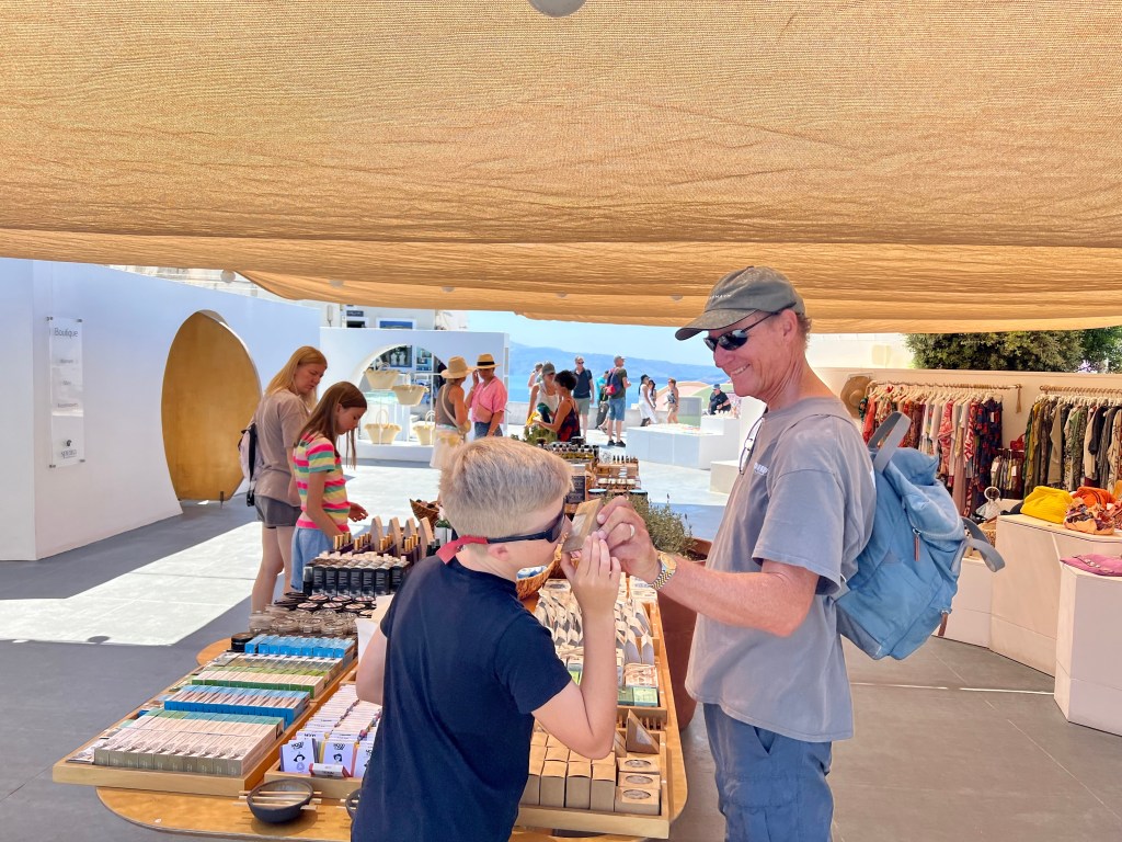 Charming and quintessential, Oia is the lovely cliff top town on the North side of the island. The shops, though certainly catering to tourists, (and there are many that have the cookie cutter “evil eye “likely made in China), are many artist shops and special places that reflect the unique nature of Thira. The lovely and Jet set abound up and down the streets crammed with restaurants and those iconic white buildings with blue accented doors and domes. But it works. Arriving by dinghy at the port, we were all a bit daunted by the site of several hundred steps to the top but Laurie, Sarah and Ryan climbed up while Alec and Jack (worn out from our 2 very large and steep hikes in Folegandros) opted to take the donkey to the top.