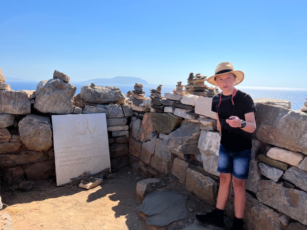 Jack and I struggled to get through Homers’ Iliad and Odyssey a couple of years ago. We never quite finished it – Jack was only 9 or 10 at the time and it was foolish of me to foist it on him. But we did enjoy the stories contained within through BBCs programs of narrating fantastic stories from the Iliad. It was with those tales in our mind that we have been enjoying our tour of the Greek islands. Ios is the presumed burial place of Homer, and it is here we found his “gravestone” and small monument to his work. This visit has re-invigorated my desire to re-read and understand Homer and his famous Iliad and Odyssey.