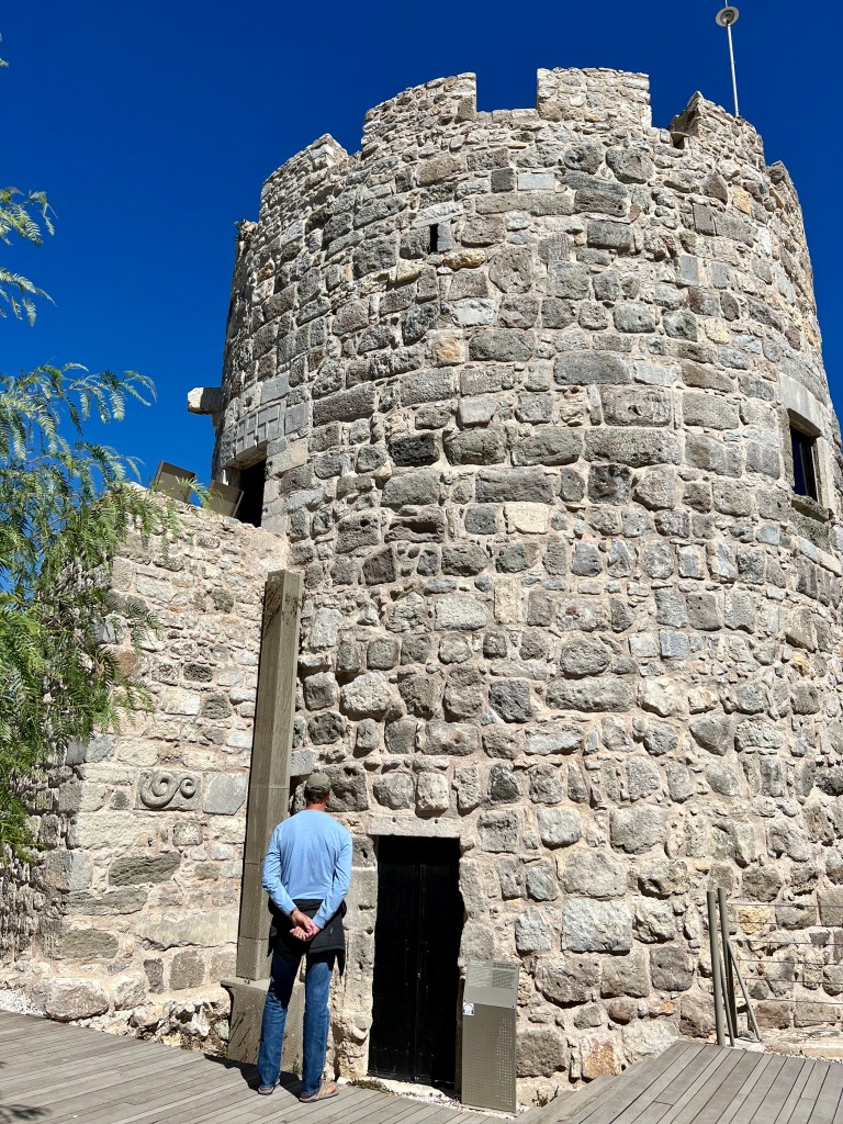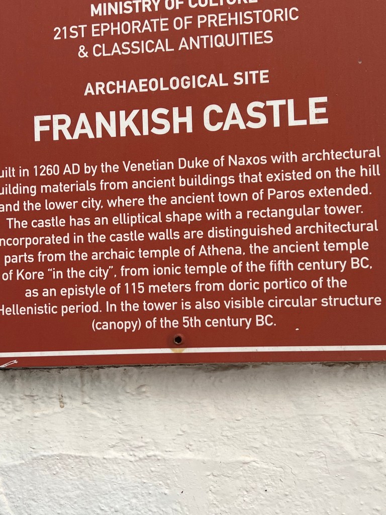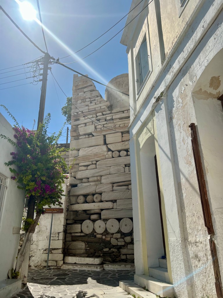 2 highlights of our time in Parikia include the Frankish Castle, built in 1260 by Venetian Duke of Naxos, it is comprised of “building materials” from the archaic temple of Athena. What has resulted is a fantastically interesting structure, the pictures of which are below. In town, art galleries have photographs and artistic renderings of this iconic building. We did see a similar use of past building supplies resulting in a magnificent old building in Croatia. But despite the frequent use of old building materials through the centuries, these are the only 2 buildings we have ever seen with this unique “style”