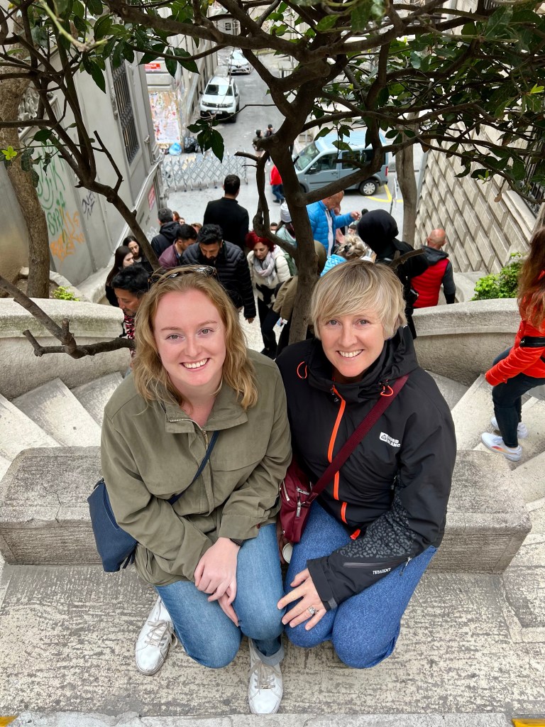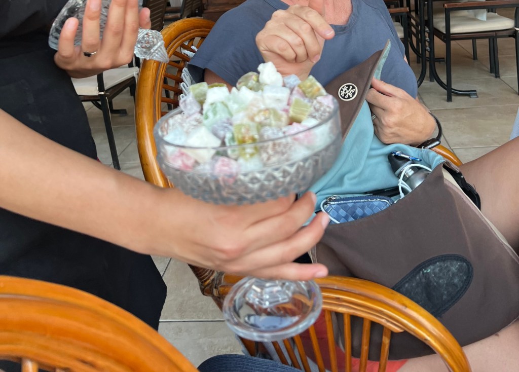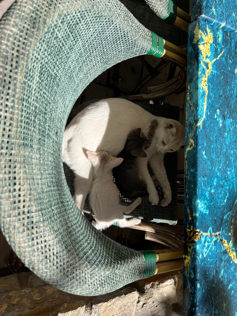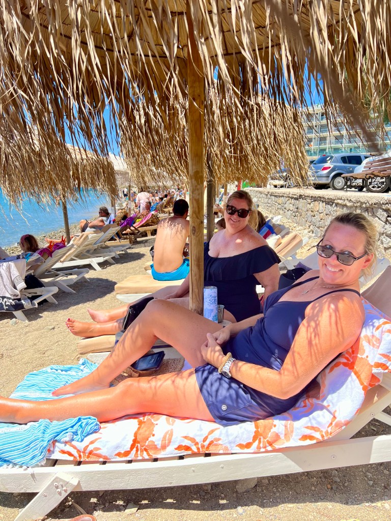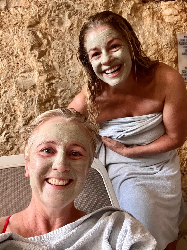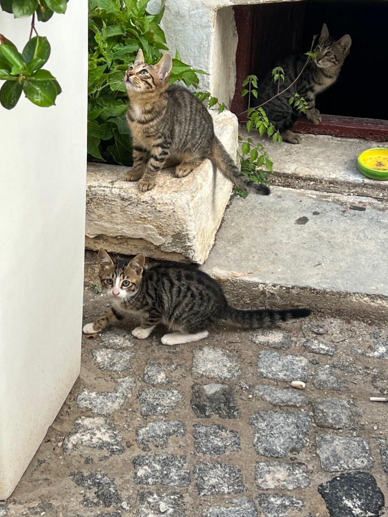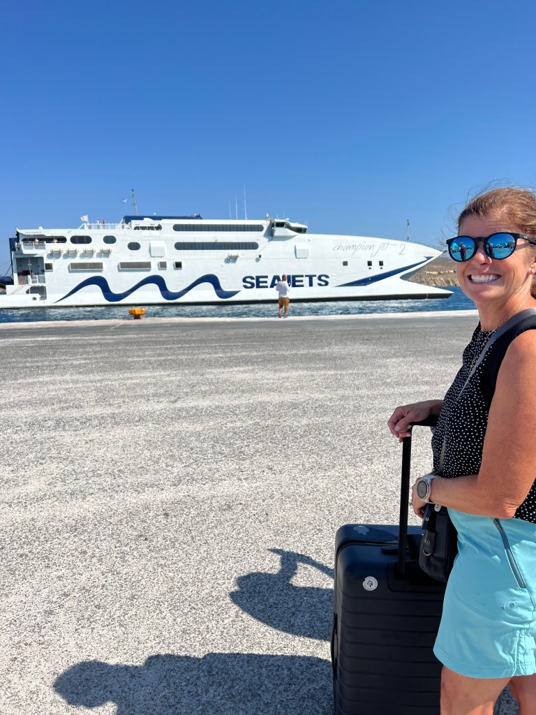 I was able to enjoy Santorini a couple different ways, first while we were moored in Thirassia while awaiting my sister Kelly’s arrival, and then later when I took a ferry to meet Jen and Tracy. Both trips were totally different but equally enjoyable. With Kelly we were aboard Gratitude, and we took the dinghy over the Oia where we hiked, shopped, and dined on beautiful food. We met a few lovely humans away from the hustle and bustle of the main island and it was these encounters which left me with a sense of the soul of the place. With Jennifer and Tracy, I met them at a lovely hotel (for lack of a better word). But “hotels” on Thira are truly in a class by themselves. The nicer of them, such as where we stayed, provided multiple rooms housed in one shared space with our own small wading pool. Truly God help the humans who daily deliver luggage to the inhabitants perched on the side of a mountain. These men (I didn’t see any women doing this job) climb up and down the cobbled stoned paths carrying cases larger than a child. They do this with a smile on their face and commitment of service.