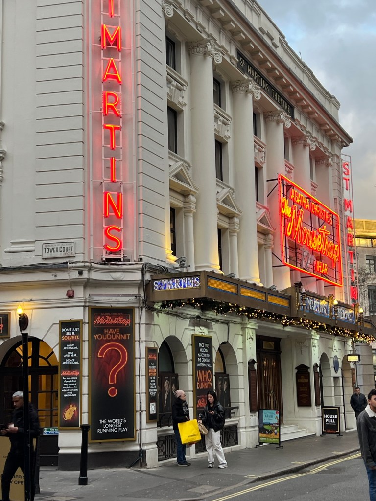 We first heard of the longest continuous show on the West End (with the exception of the covid closing) when visiting Agatha Christies summer home near Darthmouth on the south coast of England. The “MOUSETRAP” has been a favorite in London since 1952. A murder mystery in which the audience is invited to do their own sleuthing, but more importantly implored to keep the secret of “who done it” the show has never been filmed or played outside of the West end. While one can resolve the mystery with a simple google search (DONT DO IT!!), part of the fun is the joy of joining tens of thousands of others who have seen this fun murder mystery played out on stage in live theatre. We enjoyed this with my niece Sarah and her boyfriend Ryan. They are not fans of musicals, so this was the perfect live show to watch with them.