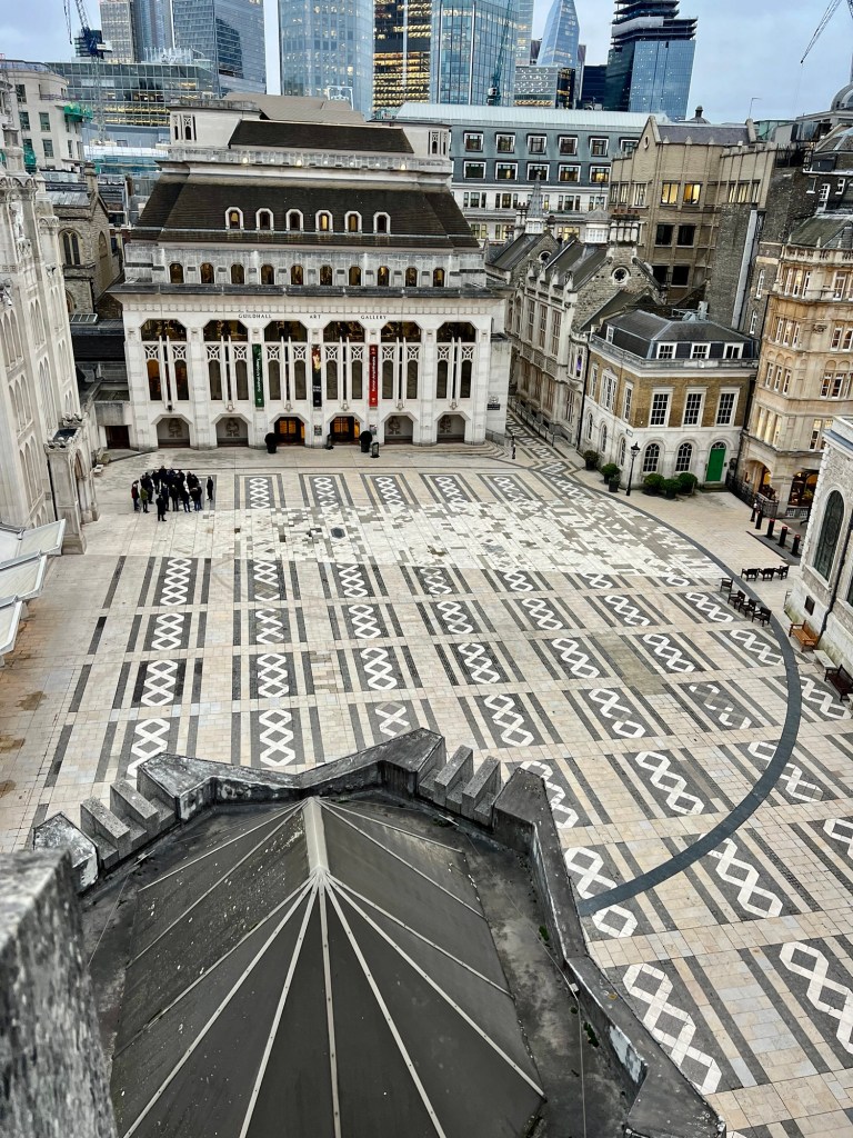 The Romans, when founding Londinium, placed their Amphitheatre here in 70AD. If you are lucky enough to get the birdseye view, the black marble circle is where the Roman built their amphitheater and where (buried deep below) you will rediscover ruins which were uncovered during the renovation of the Guildhall museum. When these ruins were discovered, work was halted and experts consulted. The remains of this Amphitheater are housed in the re-designed museum which takes advantage of these precious remnants of the Roman era.