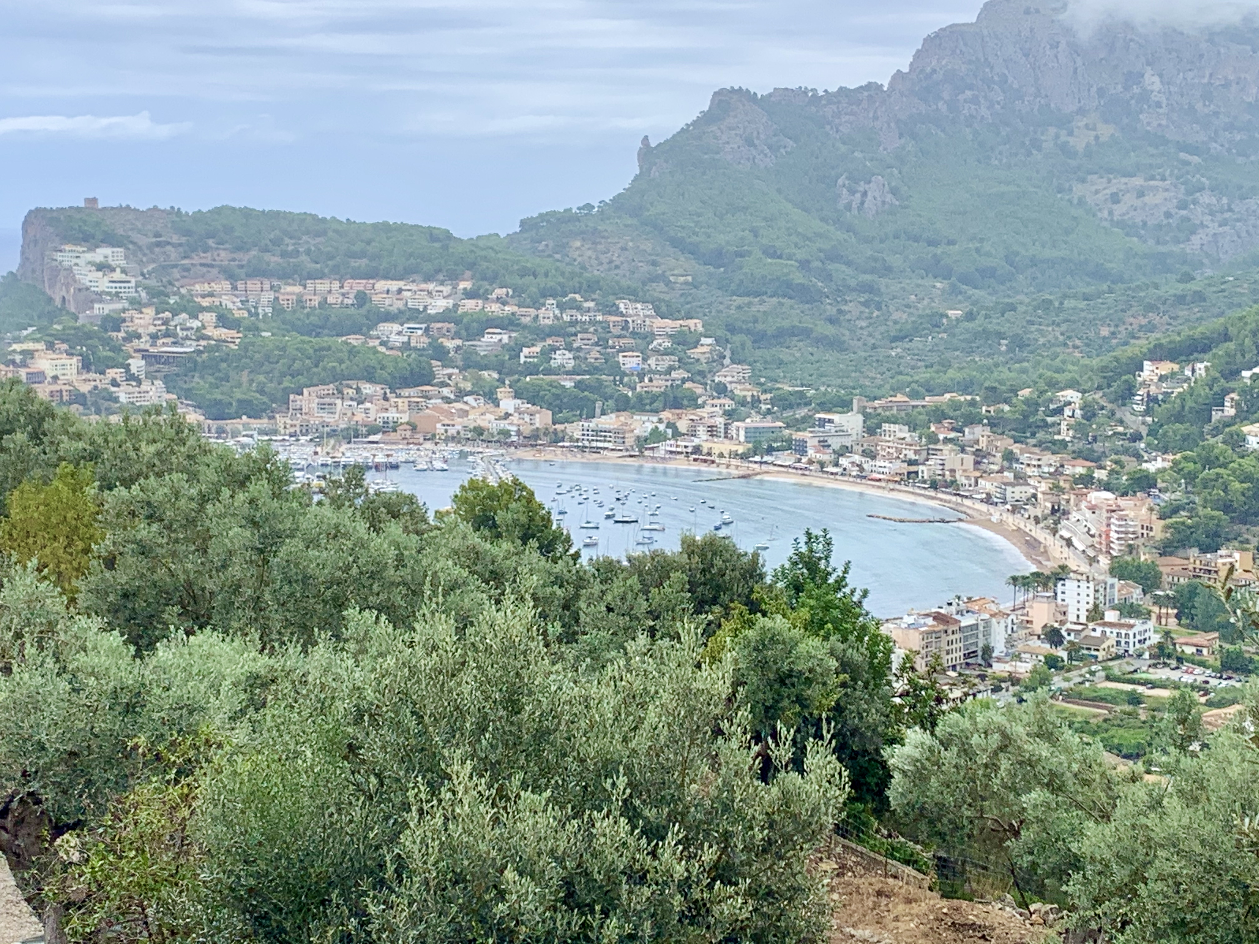 Mistrals – interesting wind events common in the Med result in the entire lee coast becoming potentially dangerous, so we were happy to be tied safely to the dock (though the surge made us feel like we were on a rolly-ride at Disney) and made boarding via the passarelle (first time we have ever used it) a challenge. A small side note, if you read the Gibraltar post on Med mooring, you may have asked yourself how does one manage to get on or off the boat without any adjacent dock on which to jump? The answer is, of course, to jump from the swim platform off the stern or a ladder from the bow – depending on which way we back into the sea wall. This was how we did it thus far but in Soller, the sea wall had an underwater ledge that made getting close impossible and really with all of the surge, we had no choice but to employ the use of the passarelle. We have thus far been reluctant to use it– honestly it just looked too complicated and unwieldy and we just preferred to jump to the dock. That strategy would absolutely not work here thus the passarelle got dusted off for the first time in 2 years. Attached to the aft bulkhead of Gratitude via some backing plates and screws, one side of the roughtly 7 foot long walkway Is secured in this manner while the other end hangs just over the ledge on the dock side held up by bungie cords connected to the davit. It is important that the dock end not be left to ride on the pavement as the boat is in constant motion and would certainly break at least the passarelle if not damage the boat. Braun and Tina gave us a little tutoring on it and Alec felt he had a pretty good handle on it – so up it went. With Gratitude bucking and rolling even tied to the dock, boarding and disembarking became an act of care and concentration