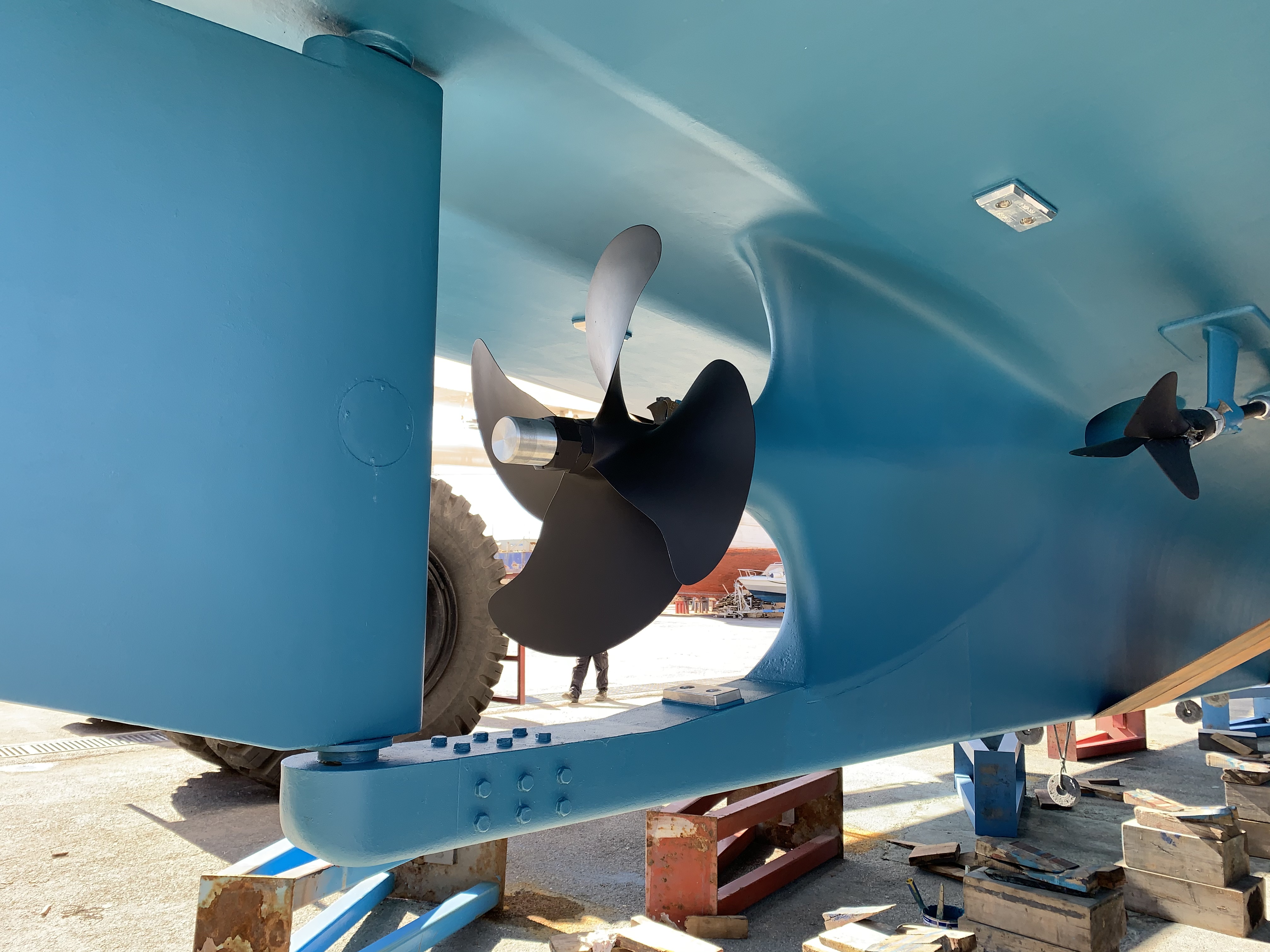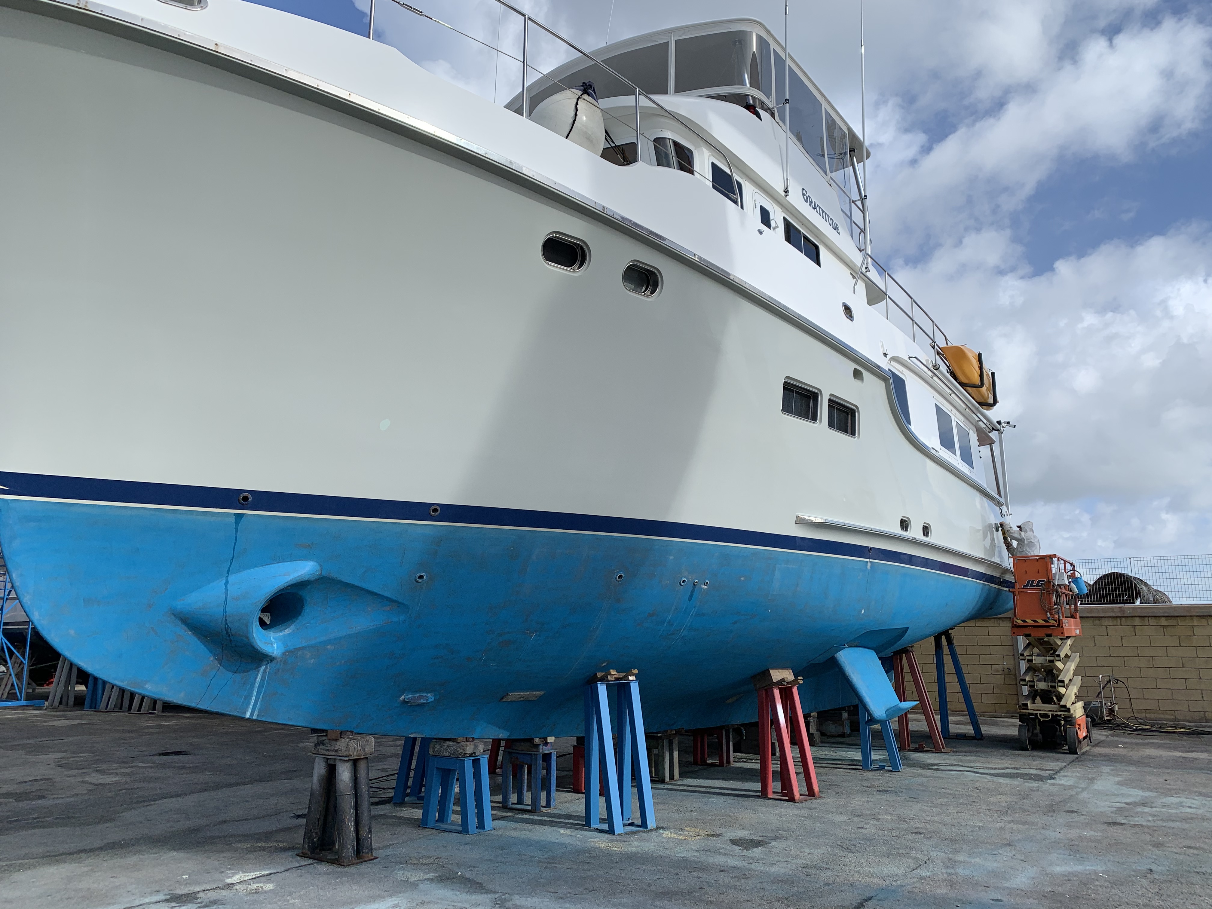 So, Gratitude was hauled out and got a full scrub and new paint on her bottom and prop. Also polished were the topsides which got a fresh coat of wax.