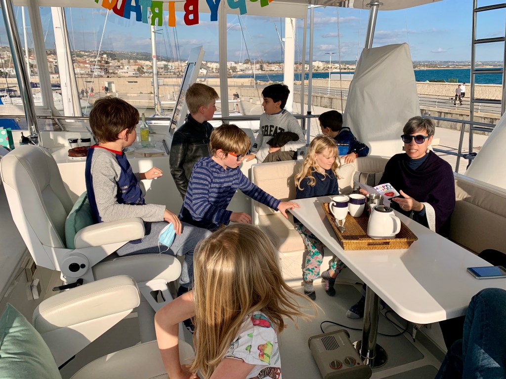 The next most frequent question or concern has been “aren’t you worried that Jack won’t have any socialization?”. Anyone who reads our blog or follows us on Instagram can answer that question. Below we are sharing a classic American meal aboard Gratitude with our Italian friends and they celebrated their “Carnavale” and “Fathers day” with us. In addition, we have daily interaction with other friends and boat schooled families. So, nope, not worried about socialization. He is learning about other cultures and in the process becoming more empathetic and openminded.