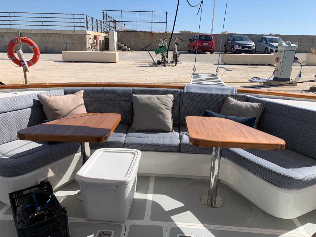 The cushions on the exterior needed to be replaced so we took care of that while in Sicily and before going to the yard. We are so very pleased with the result, the photos are above and below.
