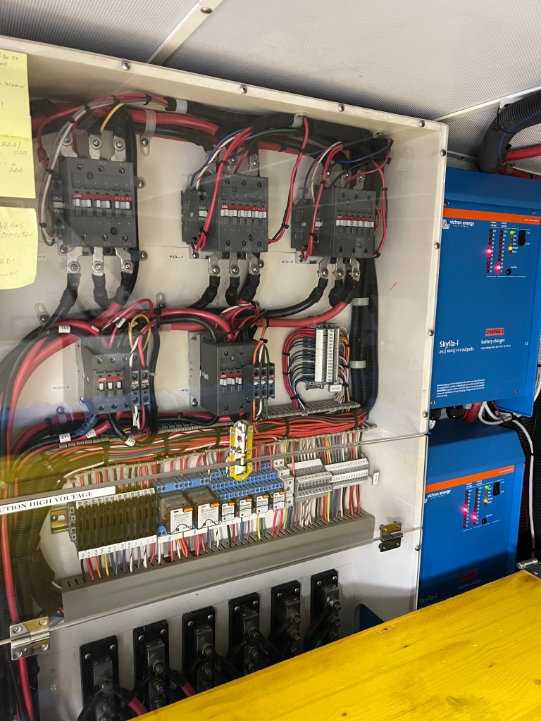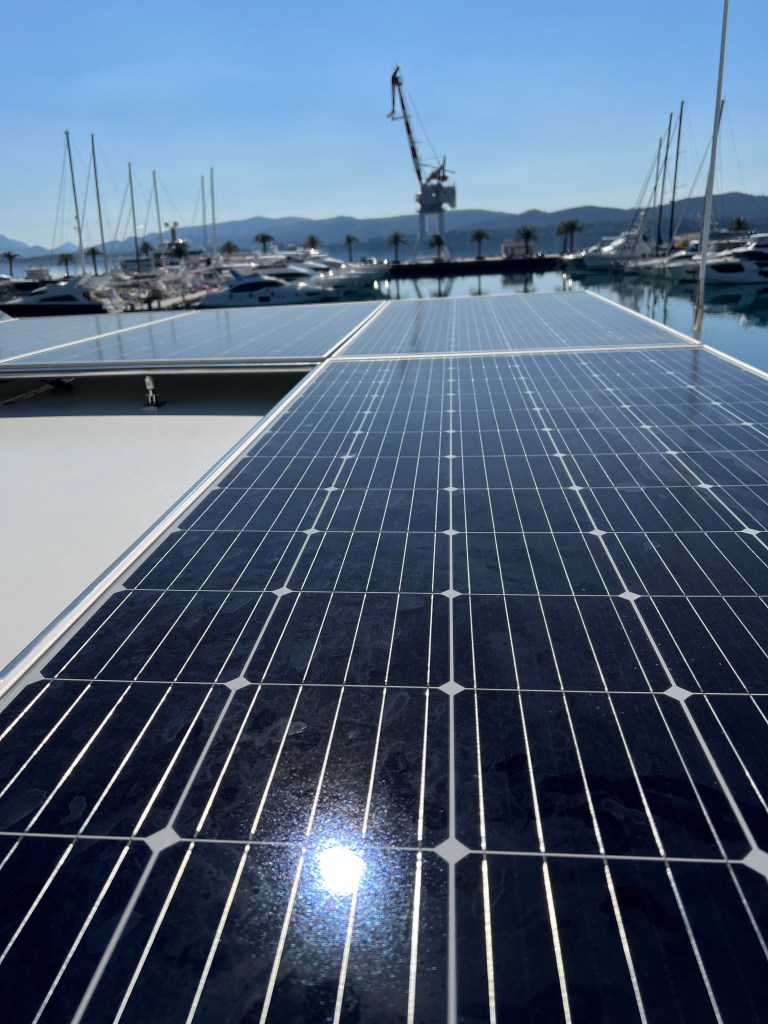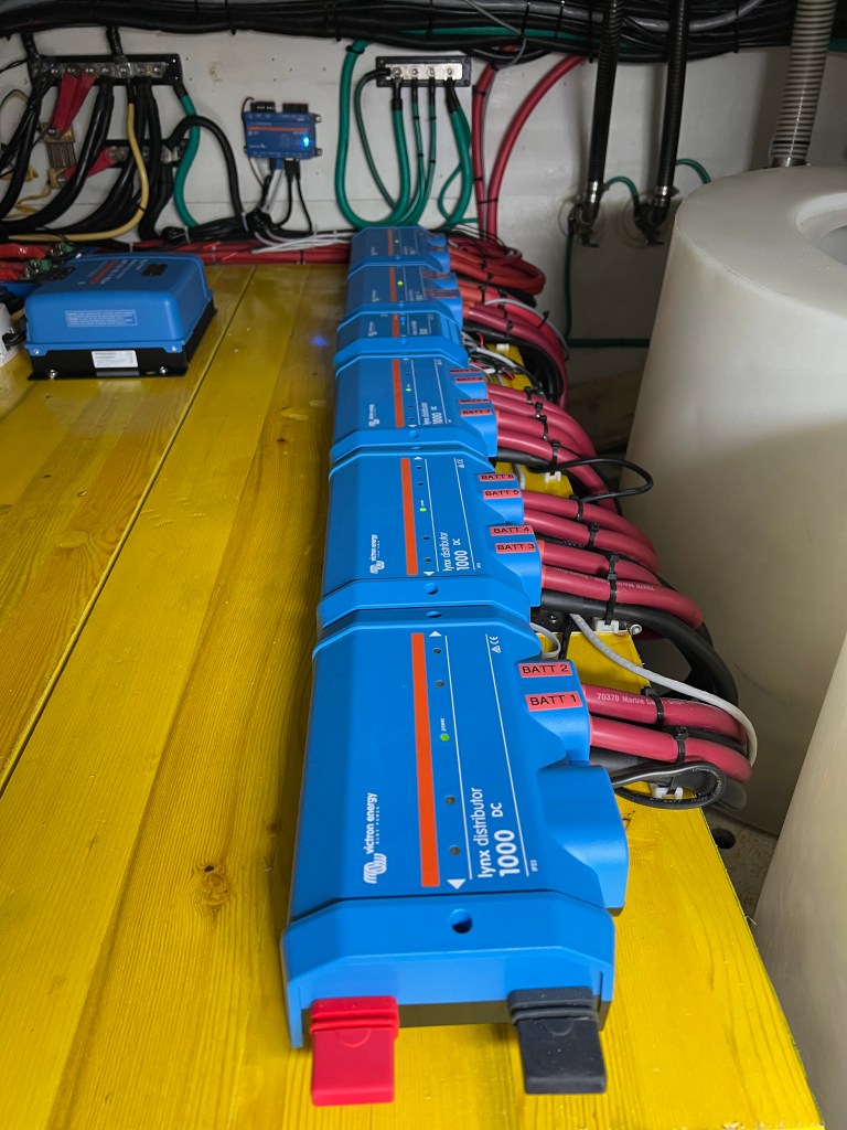 The cost of this new technology was approximately 50,000.00 Euro. For this rough price estimate, we received 10 Victron Lithium-Iron batteries, 2 -5000 watt Quattro inverters, 2-Skylla-i 100 Amp chargers, 6 solar panels each producing 360 watts and a solar MPPT controller. The cost of installation was additional. We opted to purchase this technology by hiring a Victron Dealer who is an authorized installer and who can test the system to ensure that it is safe, efficient, and will provide a full-service life. This dealer is intended to explain the system fully and diagram it so that “work arounds” at sea and away from a technician can be affected. Some of you may have heard of the fires involved in the lithium-Ion Batteries – in fact, if you are in the airline industry you may remember some airplane fires which occurred from lithium-Ion batteries and even some laptops and cell phones. The batteries that we installed are NOT these. Our batteries are Victron Lithium-Iron, and they are considered much safer technology, but they must be installed under a specific set of parameters and fully tested before putting them into “service.”